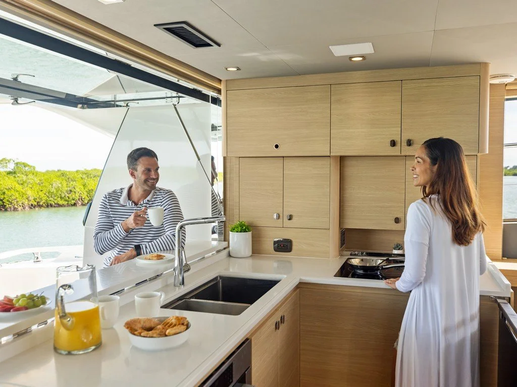 The fully equipped galley is designed for effortless entertaining, featuring an induction stove and fold out breakfast bar. Its seamless connection to the aft deck means you can prepare delicious meals while still being part of the conversation — sharing stories from the day’s adventures and planning tomorrow’s explorations.